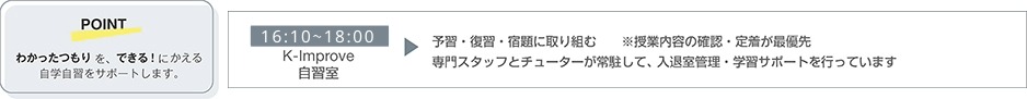 本当に学力を身に付けるには、授業で理解した(つもりの)ことを、自分で演習することが必要です。K-Improve では自分一人ではうまく続けられない学習をサポートし自学自習の習慣を身につけることができます。