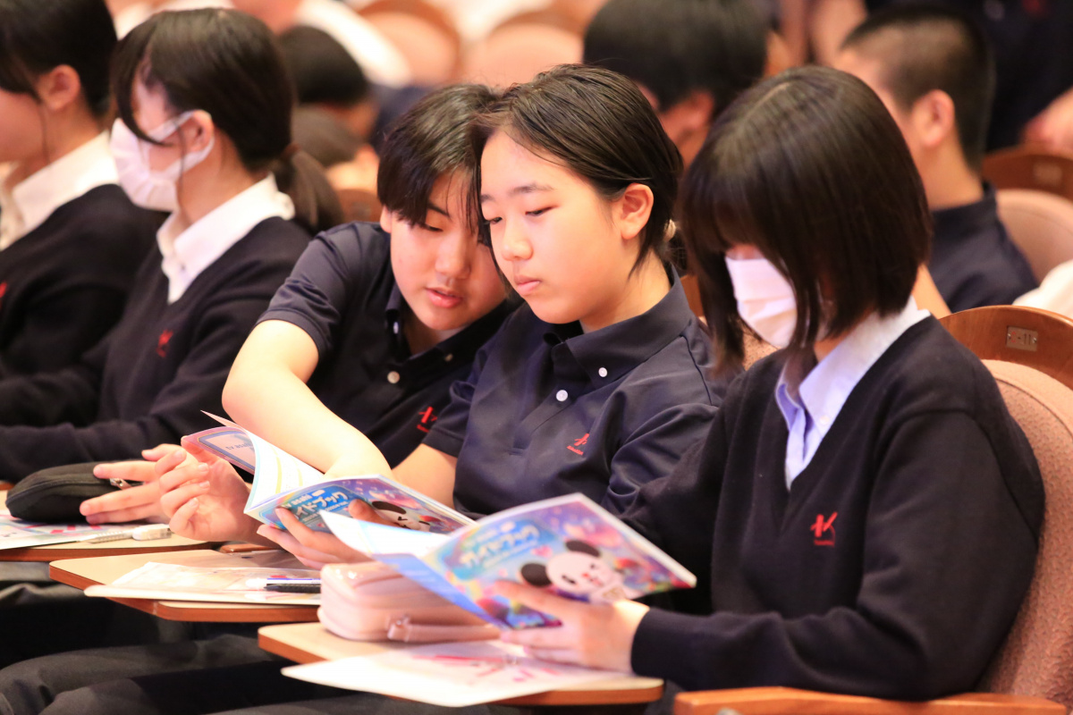 テレビ局の中での役割分担、仕事内容などの話からメディアの仕事のやりがい、今中学生として何を大切にしてほしいかなど話をしていただきました。1つの音楽番組でマイクを100本使用している、照明は400個使用しているなどクイズ形式で教えてくれ、生徒たちは楽しみながらテレビ局の仕事について学びました。