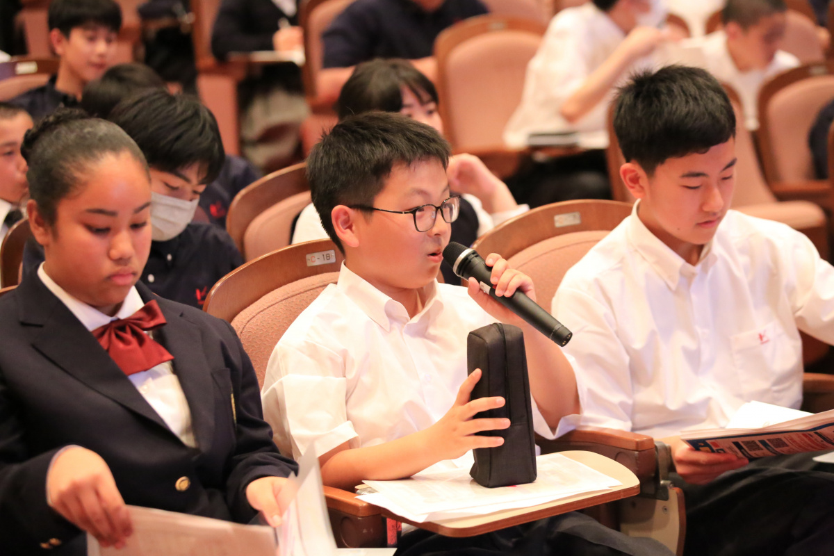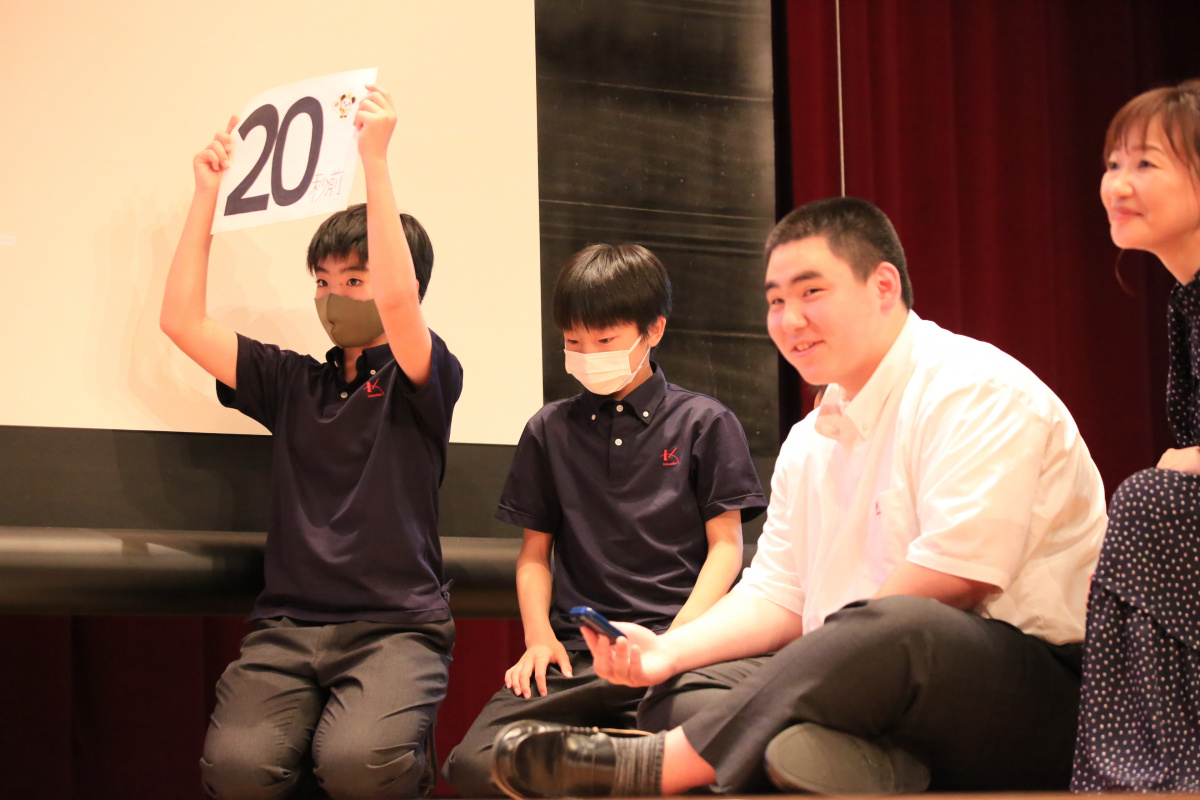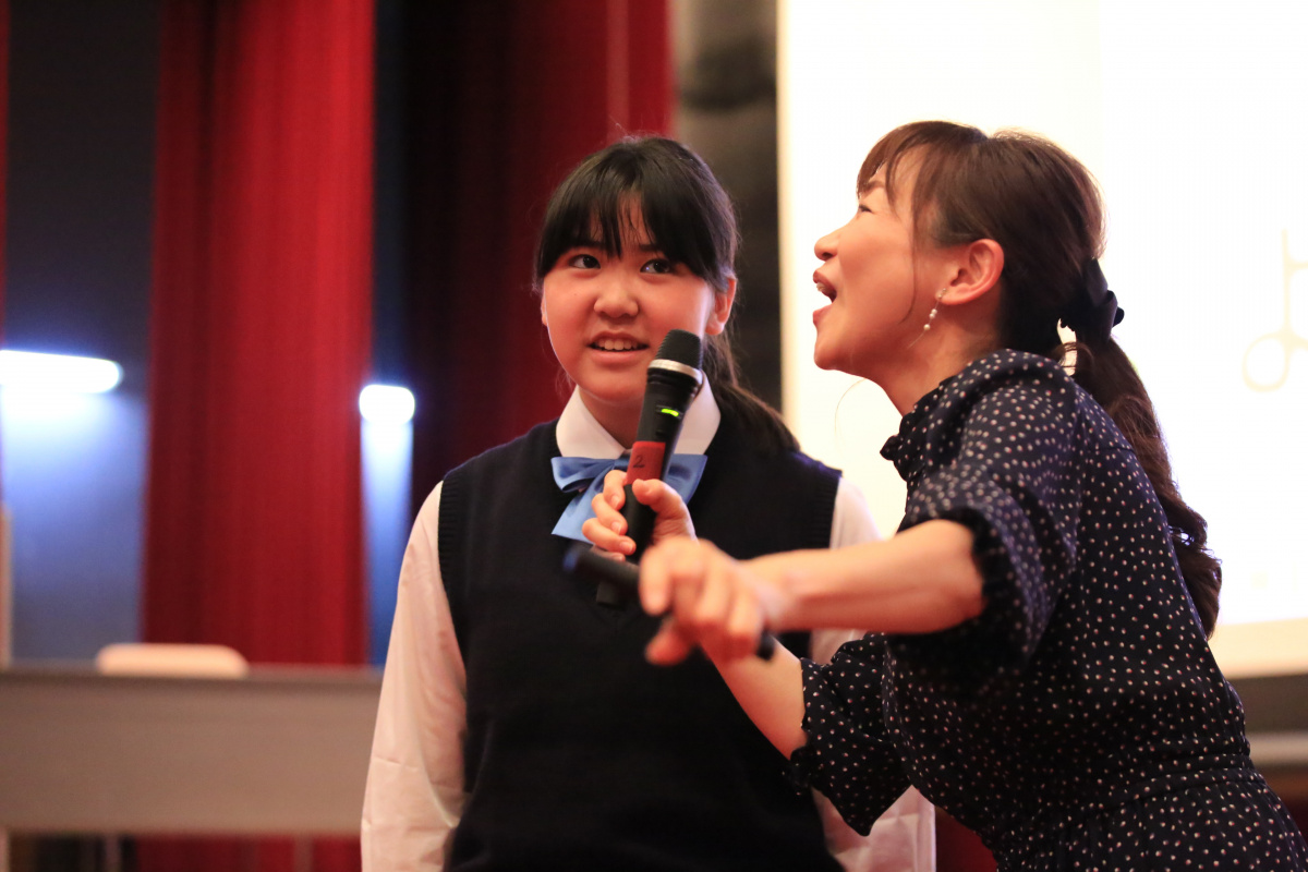 後半には職業体験として全員で発声練習をしてから映像にあわせてアナウンサーの原稿を読みました。最後にアナウンサー役、ディレクター役、タイムキーパー役の学年代表者が壇上で本番さながらの体験をしました。