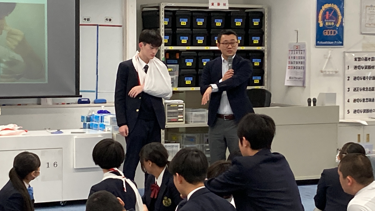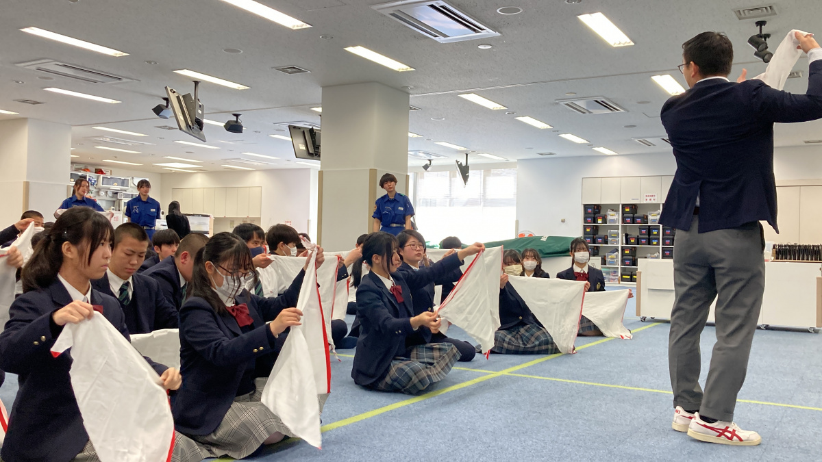 切り傷や鼻血の対処法、骨折したときにはどこを固定するかなど身近な応急処置の方法を真剣に聞き、三角巾を素早く丁寧に畳めるか競争をしたときには皆盛り上がっていました。